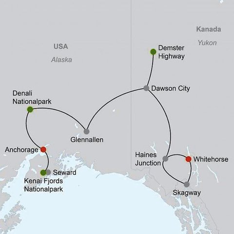 Anchorage Seward Denali Nationalpark Glennallen Dawson City Dempster Highway Whitehorse Haines Junction Kluane Nationalpark Skagway Whitehorse