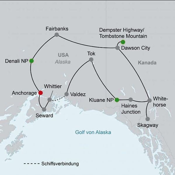 Anchorage Denali Nationalpark Fairbanks Dawson City Ausflug Dempster Highway Whitehorse Ausflug SKagway Haines Junction/Kluane NP Tok Valdez Seward