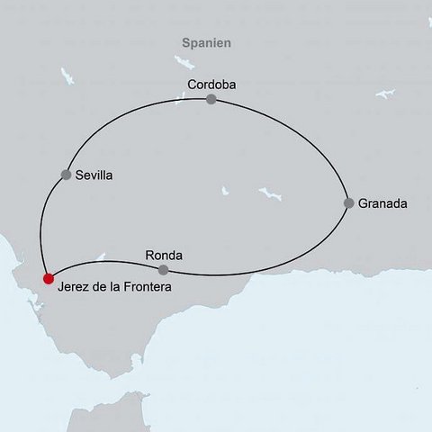- Bei Reiseterminen während besonderer lokaler Events, wie z.B. Feria de Jerez, Motorrad Weltmeisterschaft, Feria de Abril, Ostern, Feria de Ronda und 101 km Rennen, kann der Reiseverlauf abweichen.