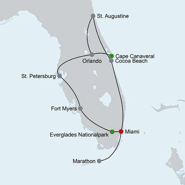 Tauchen Sie ein in die faszinierende Welt des Sunshine State Florida mit unserer exklusiven Rundreise und Badeverlängerung. Diese unvergessliche Reise führt Sie durch Floridas schönste Orte, von der pulsierenden Atmosphäre von Miami Beach über die historischen Charme von St. Augustine bis hin zu den atemberaubenden Vergnügungsparks von Orlando. Entdecken Sie die Südspitze der USA in Key West, erkunden Sie die geheimnisvollen Everglades und entspannen Sie an den endlosen Stränden des Sunshine State.