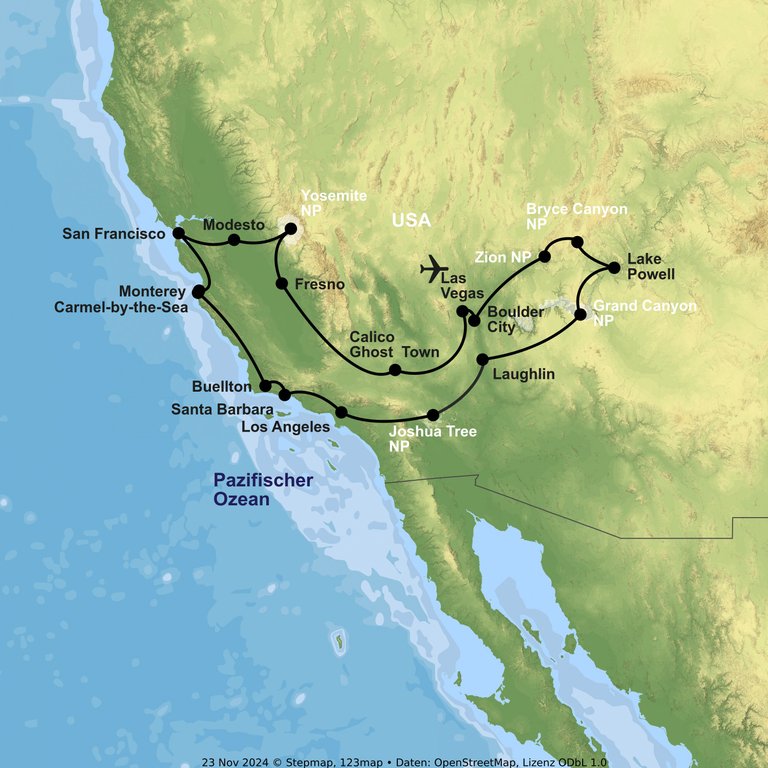 Las Vegas Calico Ghost Town Fresno Yosemite Nationalpark Modesto San Francisco Monterey/Carmel Buellton Santa Barbara Los Angeles Joshua Tree Nationalpark Laughlin Route 66 Grand Canyon Nationalpark Lake Powell Bryce Canyon Nationalpark Zion Nationalpark Boulder City Las Vegas