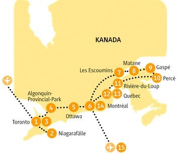 Toronto Niagarafälle Alonquin-National-Park Huntsville Ottawa Gatineau Montréal Les Escoumins Matane Percé Rivière-du-Loup Québec