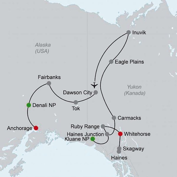 Willkommen im Yukon, wo der Charme des Nordens und die Geschichte des Goldrausches auf Sie warten. Ihre Reise beginnt in Whitehorse, der pulsierenden Hauptstadt, wo Sie in die faszinierende Welt des Goldgräbertreibens eintauchen. Unterwegs im historischen White Pass Zug nach Skagway und zurück nach Whitehorse erleben Sie eine Zeitreise. Die nächsten Tage führen Sie zur Ruby Range Lodge, am Rande des Kluane Nationalparks, wo Abenteuer in der Wildnis auf Sie warten. In Haines Junction am Fuße des Kluane Nationalparks erkunden Sie eine der größten Naturlandschaften Kanadas. Die Reise führt weiter auf dem Dempster Highway nach Inuvik, wo die arktische Atmosphäre spürbar wird. Erkunden Sie Inuvik, bestaunen Sie die Iglukirche und optional Tuktoyaktuk. Ein Flug bringt Sie nach Dawson City, eine Goldgräberstadt mit lebendiger Geschichte. Der Top of the World Highway führt Sie nach Tok und weiter nach Fairbanks, wo Alaska Sie mit seiner Natur verzaubert. Der Höhepunkt der Reise ist der Denali Nationalpark, wo majestätische Gipfel und wilde Tiere auf Sie warten. Die Reise endet in Anchorage, wo Sie Ihre Nordland-Erkundung Revue passieren lassen können.
