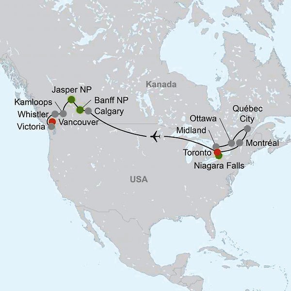 Toronto Montréal Québec City Ottawa Midland Niagara Falls Calgary Banff Nationalpark Jasper Nationalpark Kamloops Whistler Victoria Vancouver