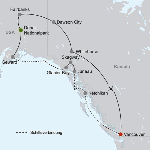 Vancouver Sunshine Coast Inside Passage Katchikan Juneau Skagway Glacier Bay Seward Denali Fairbanks Dawson City Whitehorse