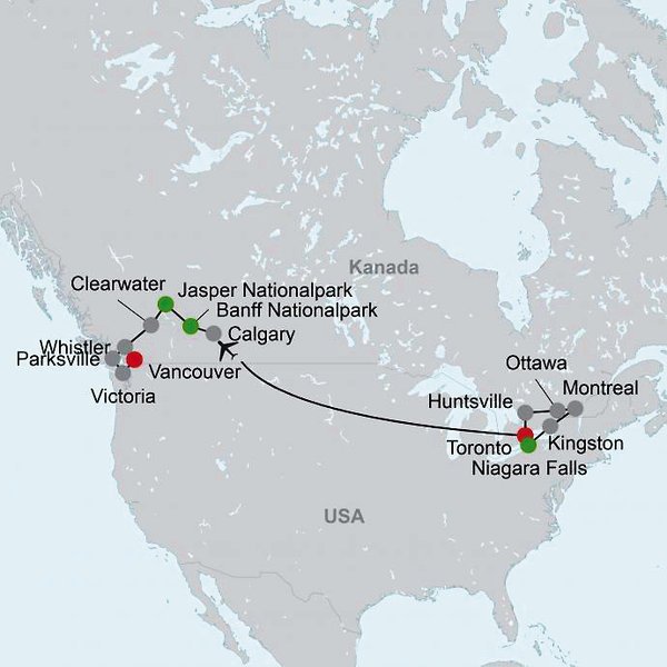 Toronto Huntsville Algonquin Provincial Park Ottawa Montreal Kingston Niagara Falls Calgary Banff Banff Nationalpark Jasper Japser Nationalpark Wells Grey Provincial Park Clearwater Whistler Vancouver Island Parksville Victoria Vancouver