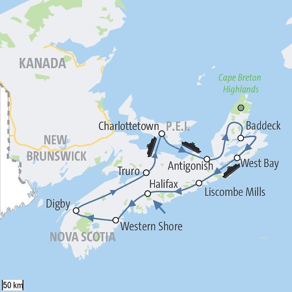 Diese facettenreiche Autoreise entführt Sie in eine Welt voller historischer Schätze, atemberaubender Küstenlandschaften, malerischer Inseln und intakter Natur. Erleben Sie die reiche Vergangenheit und lebendige Kultur von Halifax, lüften Sie die Geheimnisse von Oak Island, bestaunen Sie die beeindruckenden Gezeiten der Bay of Fundy und lassen Sie sich von Prince Edward Island mit all seinem Charme verzaubern. Von idyllischen Wanderungen in Nationalparks bis hin zu entspannten Tagen an Seen und Meeresküsten. Diese Reise verspricht ein vielfältiges Abenteuer, das Sie tief berühren wird. Bereiten Sie sich darauf vor, unvergessliche Entdeckungen zu machen, von inspirierenden Landschaften zu schwelgen und zahllose unvergessliche Augenblicke während Ihrer Erkundungstour durch Nova Scotia zu erleben!