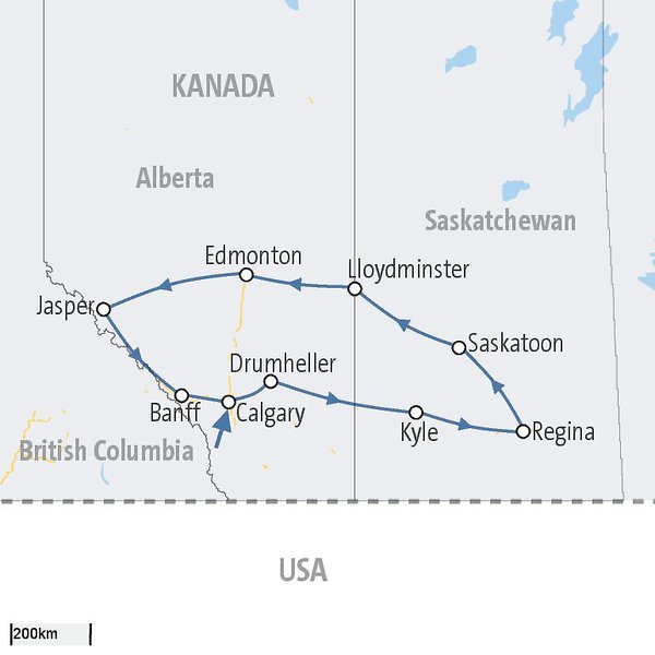 Unsere Autoreise beginnt in der lebhaften Metropole Calgary, wo moderne Urbanität auf wilde Natur trifft. Von hier aus erkunden wir die geheimnisvollen Badlande von Drumheller, wo vergangene Zeitalter in Form von Dinosaurierfunden auferstehen. Auf der La Reata Ranch tauchen wir ins echte Cowboy-Leben ein und erleben die Weiten der Prärie hautnah. Unsere Route führt uns weiter in den Wanuskewin Heritage Park, wo Jahrtausende alte Geschichten und Natur in Harmonie verschmelzen. In Jasper spüren Abenteuerlustige die Freiheit der Natur, während der Icefields Parkway uns durch atemberaubende Landschaften bis nach Banff führt. Die Reise endet in Calgary, wo wir inmitten urbaner Raffinesse zur Ruhe kommen. Eine unvergleichliche Reise voller Kontraste, unvergesslicher Erlebnisse und inspirierender Geschichten erwartet uns in Kanada!