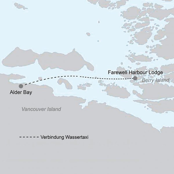 An Bord eines Wassertaxis beginnt Ihre szenenreiche Fahrt von Alder Bay aus entlang der Johnstone Strait bis zur Farewell Harbour Lodge auf Berry Island (ca. 25 Min.). Eingebettet zwischen Vancouver Island und Festlandkanada liegt Berry Island, ein wahres Juwel im Broughton Archipel. Die Insel besticht nicht nur durch ihre malerische Lage umgeben von unberührter Natur, sondern zählt auch zu einem der besten Orte in ganz British Columbia, um Orcawale und Grizzlybären zu beobachten. Nach Ankunft in der Lodge Begrüßung durch das Personal und kurze Führung. Nach dem Mittagessen geht es auf eine Bootsfahrt zu den großen Meeressäugern der Region. Von Anfang Juni bis Mitte Oktober können Sie Buckelwale, Stellers Seelöwen, Weißseitendelfine und Dall-Tümmler beobachten, in der Lachssaison von Mitte Juli bis Ende September auch Orcas auf ergiebiger Nahrungssuche. Rückkehr zur Lodge gegen 16.30 Uhr und Abendessen mit den anderen Gästen der Lodge. Gemütlich lassen Sie den Abend in der zauberhaften Umgebung am Kamin ausklingen. Bei einer Präsentation lernen Sie mehr über das Ökosystem dieser Küstenregion. 3 Nächte in der Farewell Harbour Lodge (Mittelklasse). (Mittagessen, Abendessen)