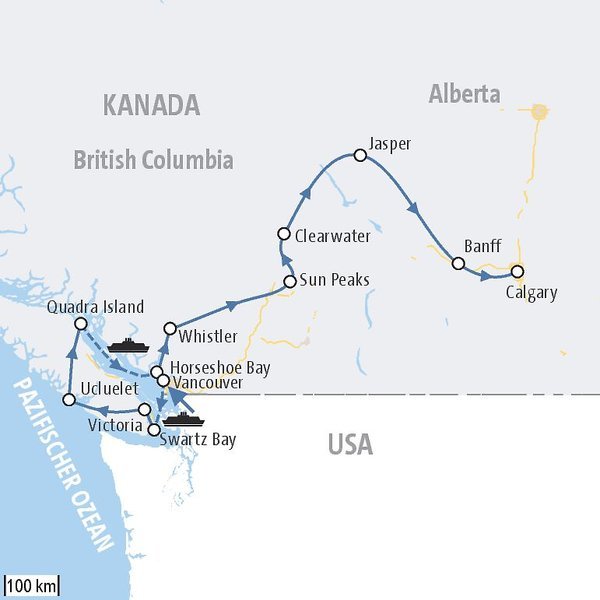 Vancouver Victoria Ucluelet Pacific Rim Nationalpark Quadra Island Whistler Clearwater Jasper Banff Nationalpark Calgary