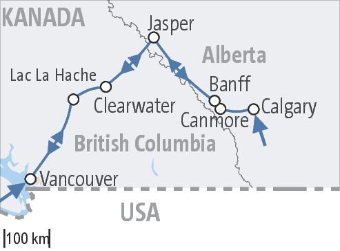 Calgary Canmore Banff Nationalpark Jasper Nationalpark Clearwater Wells Grey Park Lac La Hache Whistler Vancouver