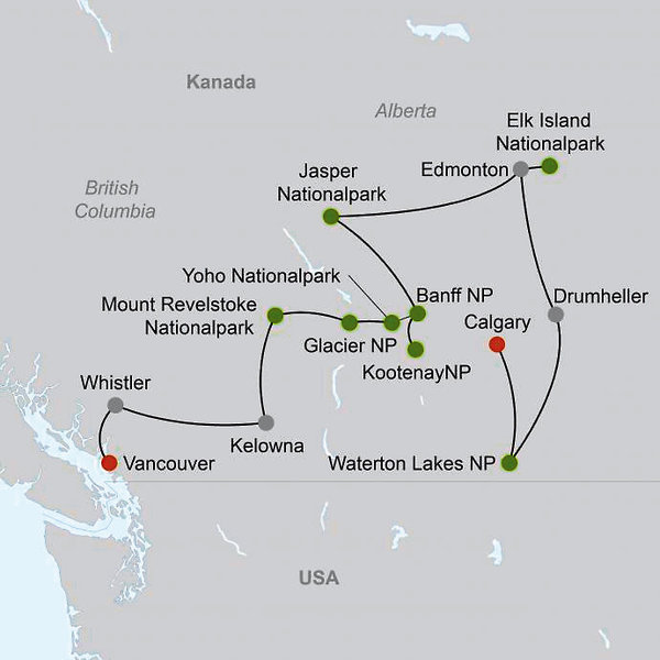 Calgary Whistler Waterton Lakes Nationalpark Drumheller Edmonton Elk Island Nationalpark Edmonton Jasper Nationalpark Banff Nationalpark Kootenay Nationalpark Revelstoke Kelowna Vancouver