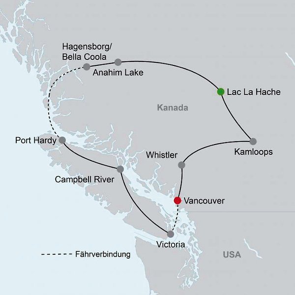 - Fährfahrten (Personen + Fahrzeug): Horseshoe Bay - Langdale (9. Tag); Langdale - Horseshoe Bay - Nanaimo (11. Tag); Swartz Bay - Otter Bay (13. Tag); Otter Bay - Tsawwassen (15. Tag)