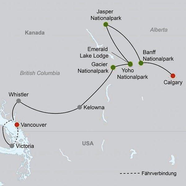 Calgary Banff Nationalpark Jasper Nationalpark Emerald Lake Lodge Kelowna Whistler Victoria Vancouver