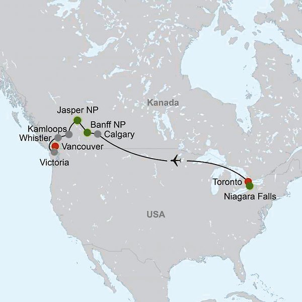 Toronto Niagara Falls Calgary Banff Nationalpark Jasper Nationalpark Kamloops Whistler Victoria Vancouver