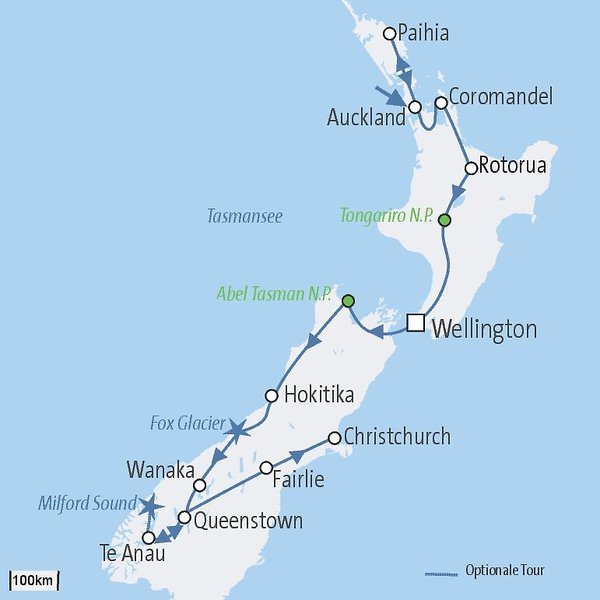 Auckland Paihia Coromandel Halbinsel Coromandel Rotorua Tongariro Nationalpark Wellington Abel Tasman Nationalpark Hokitika Fox Glacier Wanaka Te Anau Queenstown Fairlie Christchurch