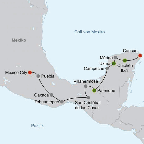 Mexico City Puebla Oaxaca Tehuantepec San Cristóbal de las Casas Palenque Campeche Mérida Cancún