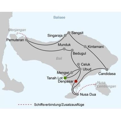 Bali – die „Insel der Götter und Dämonen“ – inmitten der Inselwelt Indonesiens fasziniert mit Tausenden hinduistischen Tempeln und imposanten Vulkanen, die über 3000 Meter hoch in den Tropenhimmel aufragen und als Sitz der Götter gelten. Kunstvoll angelegte Reisterrassen, Traumstrände am türkisfarbenem Indischen Ozean und die offene Gastfreundschaft der Balinesen erwarten Sie. Lassen auch Sie sich von der Magie Balis in ihren Bann ziehen!