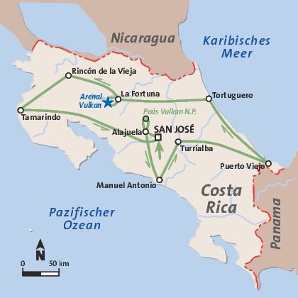Hinweis: Programm-/Routenänderungen vorbehalten. Bitte beachten Sie, dass der Nationalpark Manuel Antonio dienstags und der Nationalpark Rincón de la Vieja montags geschlossen sind. Wir empfehlen die Buchung eines GPS-Systems oder Hot Spots, da es in Costa Rica teilweise keine oder nur unzureichende Straßenbeschilderung gibt.