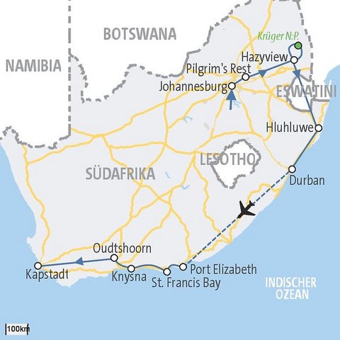 Johannesburg Hazyview Panoramaroute Krüger Nationalpark eSwatini Hluhluwe Durban Port Elizabeth St. Francis Bay Knysna Oudtshoorn Kapstadt