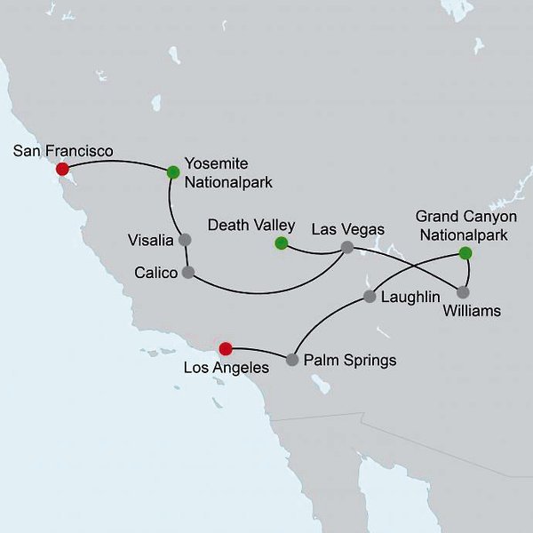 Los Angeles Palm Springs Laughlin Grand Canyon Nationalpark Williams Las Vegas Death Valley Las Vegas Visalia/Selma Yosemite Nationalpark San Francisco