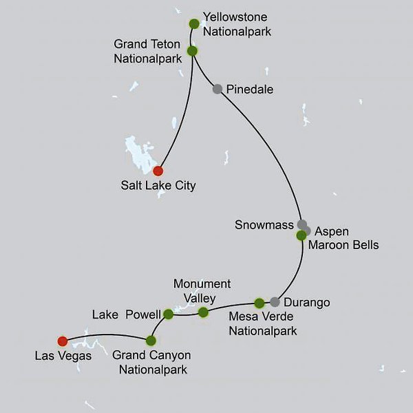 Salt Lake City Grand Teton Nationalpark Yellowstone Nationalpark Pinedale Glenwood Springs Aspen Maroon Bells Durango Mesa Verde Nationalpark Monument Valley Lake Powell Grand Canyon Nationalpark Las Vegas
