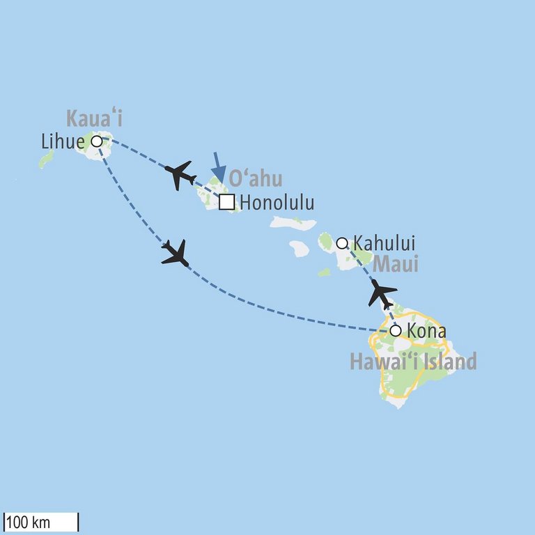 Erleben Sie auf dieser Hawaii-Intensiv-Reise die vier großen Inseln Hawaiis unabhängig mit dem Mietwagen. Mit Palmen, Vulkanen, goldenen Stränden und dichtem Regenwald entführt Sie der schönste Inselstaat der USA in ein Paradies, das Sie mit seinen tropischen Naturschönheiten bezaubern wird. Auf Oahu lockt Honolulu mit spannenden Einblicken in die Geschichte der Inseln und lädt zugleich mit fantastischen Stränden zum Surfen ein. Anschließend begeistert Kauai, die älteste Insel Hawaiis, mit ursprünglicher Natur, steilen Klippen und spektakulären Küstenstraßen. Auf Hawaii entdecken Sie die mächtigen Vulkane, die das Archipel bis zum heutigen Tag formen. Auch Maui wartet mit wundervollen Naturerlebnissen auf – ein würdiger Abschluss Ihres Hawaii-Roadtrips.