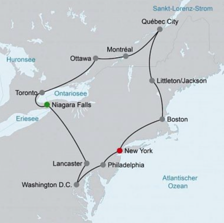 New York Boston White Mountains Québec City Montréal Ottawa Toronto Niagara Falls Lancaster Washington D. C. Philadelphia New York
