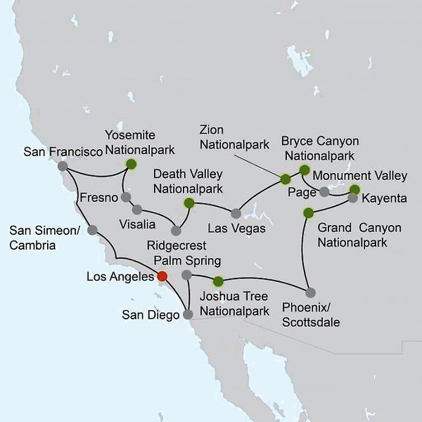 Los Angeles San Diego Palm Springs Phoenix Scottsdale Grand Canyon NP Kayenta Lake Powell Page Bryce Canyon NP Las Vegas Ridgecrest Death Valley NP Visalia Fresno El Portal Yosemite NP San Francisco San Simeon Cambria Los Angeles