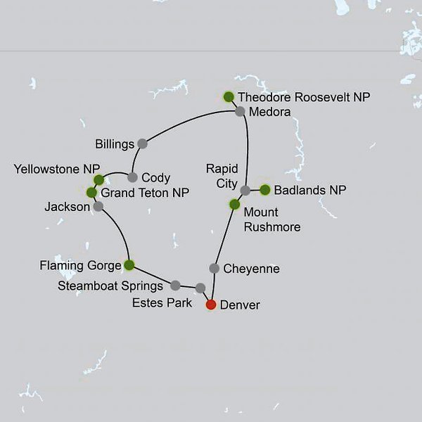 Denver Cheyenne Mount Rushmore Rapid City Badlands NP Medora Theodore Roosevelt NP Billings Cody Yellowstone NP Grand Teton NP Jackson Dutch John Flaming Gorge Steamboat Springs Estes Park Rocky Mountain NP Denver