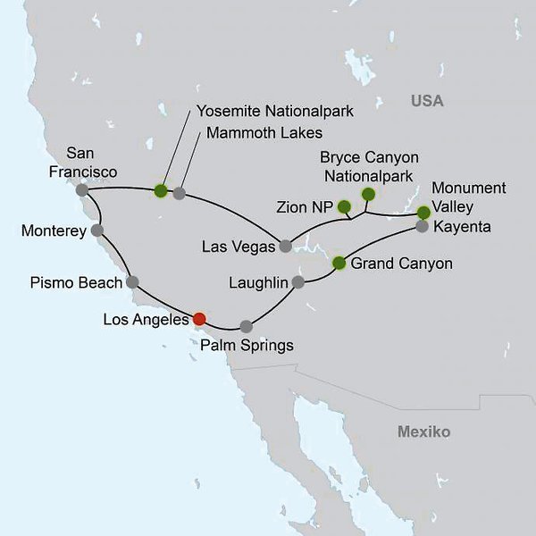 Los Angeles Palm Springs Laughlin Grand Canyon Monument Valley Bryce Canyon Las Vegas Mammoth Yosemite Nationalpark San Francisco Monterey Pismo Beach Los Angeles