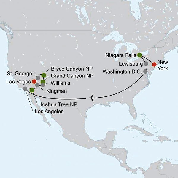 New York Niagarafälle Lewisburg Washington Los Angeles Kingman Williams Bryce Canyon City St. George Las Vegas