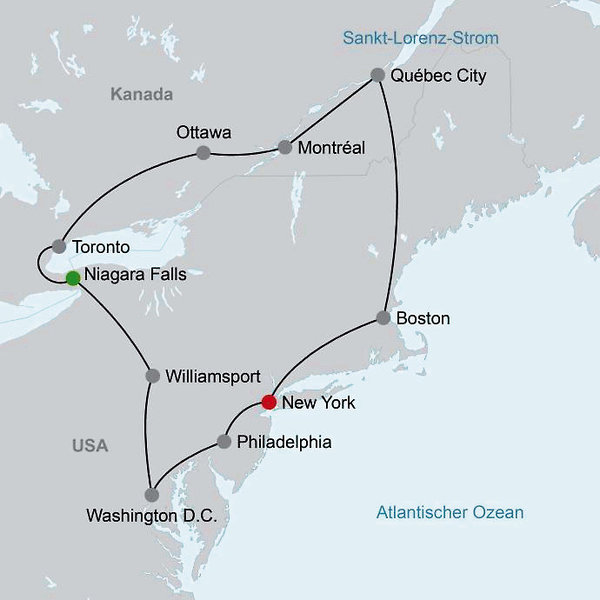 New York Boston Quebec City Montreal Ottawa Toronto Niagarafälle Williamsport Washington DC Philadelphia New York