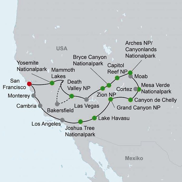 San Francisco Yosemite Nationalpark Mammoth Lakes Death Valley Nationalpark Las Vegas Grand Canyon Nationalpark Lake Havasu Los Angeles Cambria Monterey San Francisco