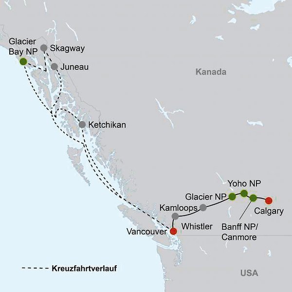 Calgary Canmore Banff Nationalpark Kamloops Whistler Vancouver Inside Passage Juneau Skagway Glacier Bay Ketchikan Vancouver